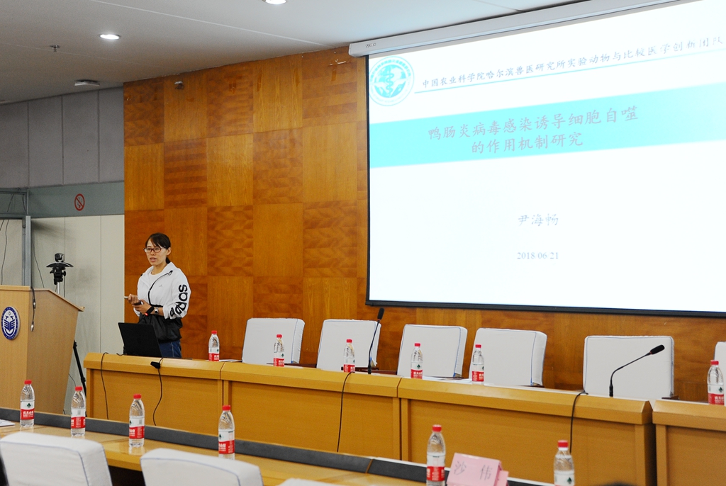 中国农业科学院哈尔滨兽医研究所的尹海畅博士作题为《鸭肠炎病毒感染诱导细胞自噬的作用机制研究》的报告。