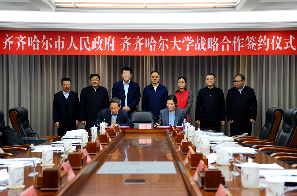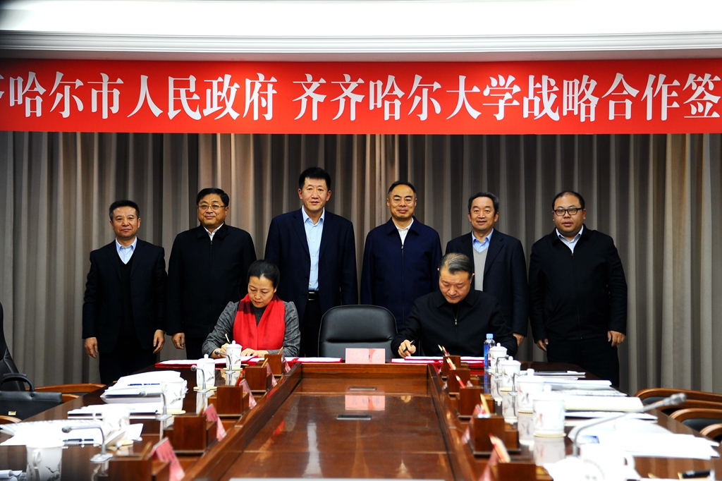 12月20日下午,齐齐哈尔市人民政府和tyc1286太阳集团战略合作签约仪式在市党政机关办公中心举行,省人大常委会副主任、齐齐哈尔市委书记孙珅,市委常委、龙江县委书记王兆宪,副市长姚卿,市政府副秘书长刘海涛,我校党委书记兰景力、校长陈桂芝、副校长李英杰、副校长吕厚均出席签约仪式。王兆宪主持签约仪式。