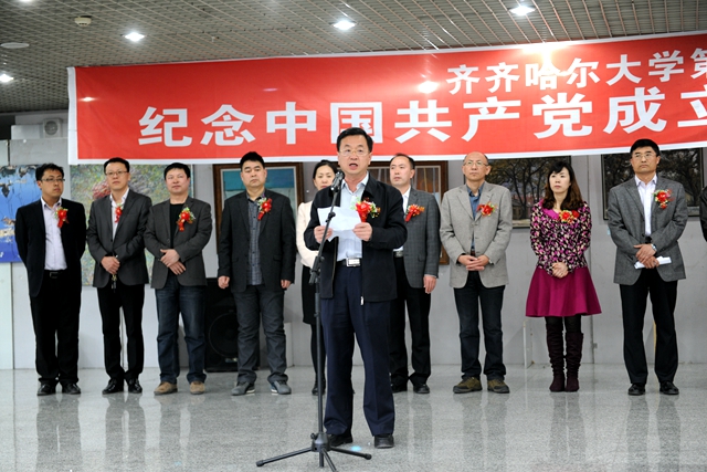 美术与艺术设计学院院长马振庆代表协办单位发言。他说,中国共产党已经走过了95年的光辉历程,我校大学生艺术节已经成功举办了18届。今天,学校以艺术作作品展览的方式庆祝建党95周年和举行艺术节开幕式,我谨代表学院师生向艺术展暨艺术节开幕表示热烈祝贺!他表示,艺术作品是作者表达思想情感的一种手段。这里所展现出的百余幅作品都是我校师生创作的作品。他们用手中的画笔塑造领袖形象,赞美祖国的山河壮丽,表现人们的幸福生活,用手中的相机真实的记录家乡的变化和自己的父老乡亲。特别是我校西藏自治区的学生在今年寒假及往返途中的随拍,生动地记录了雪域高原的人物美、景色美和家乡美,这些摄影作品十分接地气,让我们如临其境,切身感受到西藏之大美,感受到作者对美好事物的追求和对美好生活的向往,衷心预祝艺术作品展圆满成功,祝愿我校大学生艺术节越办越红火!
