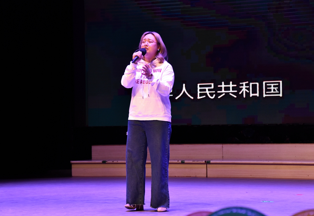 沙画不断变换,一位位伟大的领导人,一个个奇迹伴随着朗读声一幕幕出现在观众面前。许子义、孙玉欣等同学,以舞台剧的形式将《共和国之恋》呈现在观众眼前,让大家了解到如今幸福的来之不易。行进的中国,正以自己的方式让世界刮目相看。伴随着激昂的旋律一首《我爱你中国》将全场氛围带动到高潮。杨昕雯用歌声表达了对祖国的热爱,同时也激发了在场观众的爱国之情。“国是千万家,家是最小国,有了强的国,才有富的家”。