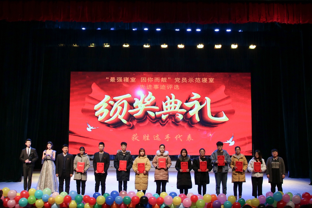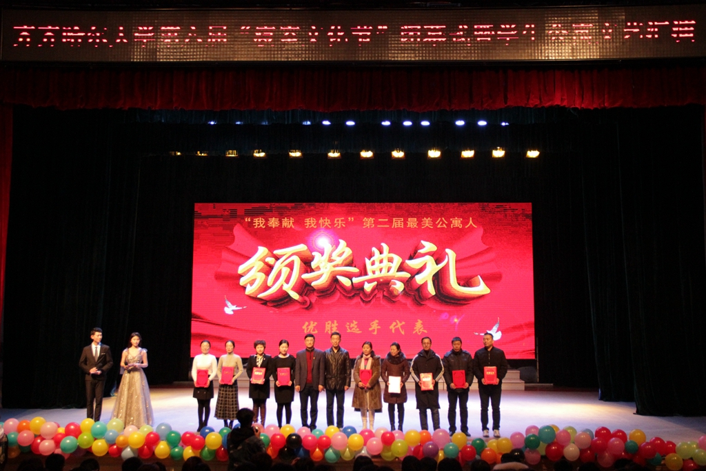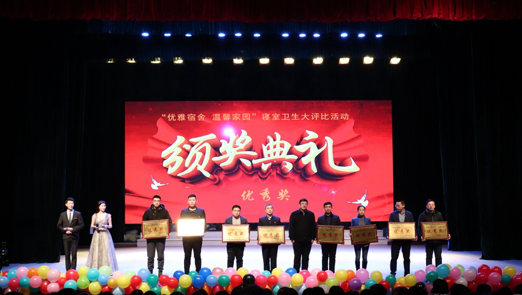 晚会期间,同时举行了第六届“寝室文化节”系列活动颁奖仪式。“我是学子贴心人”管理员岗位技能大赛优胜者、“我奉献,我快乐”第二届“最美公寓人”评选出的“最美公寓人”、“建小家,展大情怀”爱我国防演讲比赛获奖选手、“最强寝室,因你而靓”学生党员示范寝室先进事迹评选获奖选手代表、“优雅宿舍,温馨家园”寝室卫生大评比活动评选获优秀奖的学院受到表彰,出席本次活动的嘉宾分别为各获奖代表颁发获奖证书或奖牌。