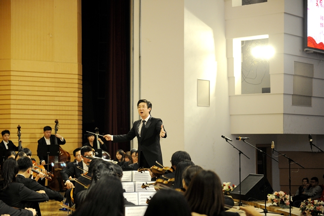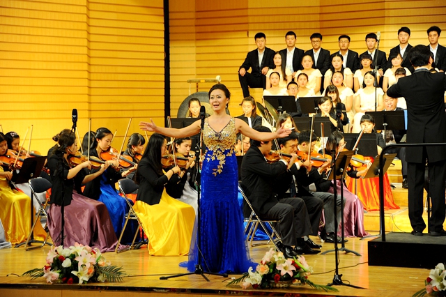 在播放视频片和纪念抗战胜利征文颁奖仪式后,“tyc1286太阳集团纪念中国人民抗日战争暨世界反法西斯战争胜利70周年文艺晚会”在交响乐团陈曦泽指挥的交响序曲《红旗颂》中拉开帷幕。