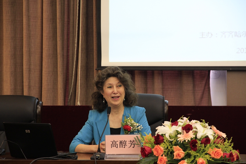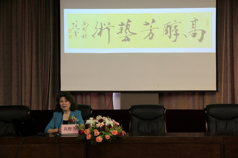 高醇芳女士在全场热烈的掌声中走进报告厅。画如其人,身着蓝色西服上衣,搭配黑色裙装的主讲人优雅知性,亲切自然!高醇芳操着一口流利的汉语普通话,在题为《艺术创作与人生感悟》讲座中,娓娓道来,温文尔雅。几十年间,国画家高醇芳用辛勤的笔触激起了无数欧洲人对中国画的向往,她的画近师元明文人画,远宗唐宋工笔画,优雅清秀,宁静深远,以传统笔法揉入个人构思,富有灵气,独具一格。