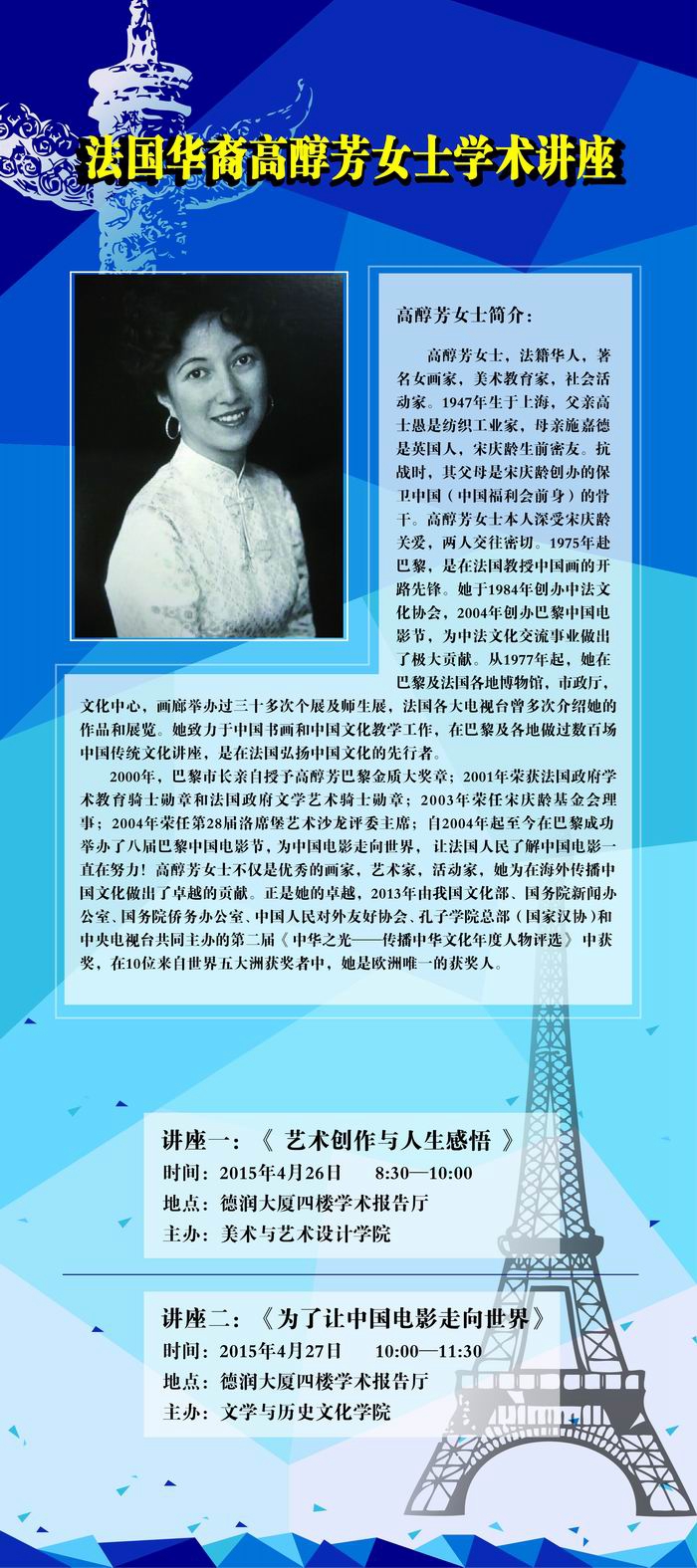 芳菲四月,谷雨时节。美丽的劳动湖畔诗意盎然,芳华流韵。4月26—27日,著名法籍华裔女画家、美术教育家、社会活动家高醇芳应邀来校讲学,《艺术创作和人生感悟》和《为了让中国电影走向世界》两场讲座让师生如沐春风,如浴芳霖。