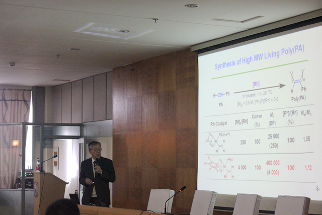 在学术报告中,增田俊夫教授系统阐述了“新型催化剂及定向聚合”、“具有螺旋结构的取代聚苯乙炔聚合物的合成及表征”、“聚苯乙炔高分子气体分离膜”和“非聚苯乙炔类功能高分子材料”。报告会结束后,增田俊夫教授就相关问题同与会师生进行了交流互动。翌日,贾宏葛博士课题组特邀增田俊夫教授于在材料学院608室进行了高分子膜学术交流。