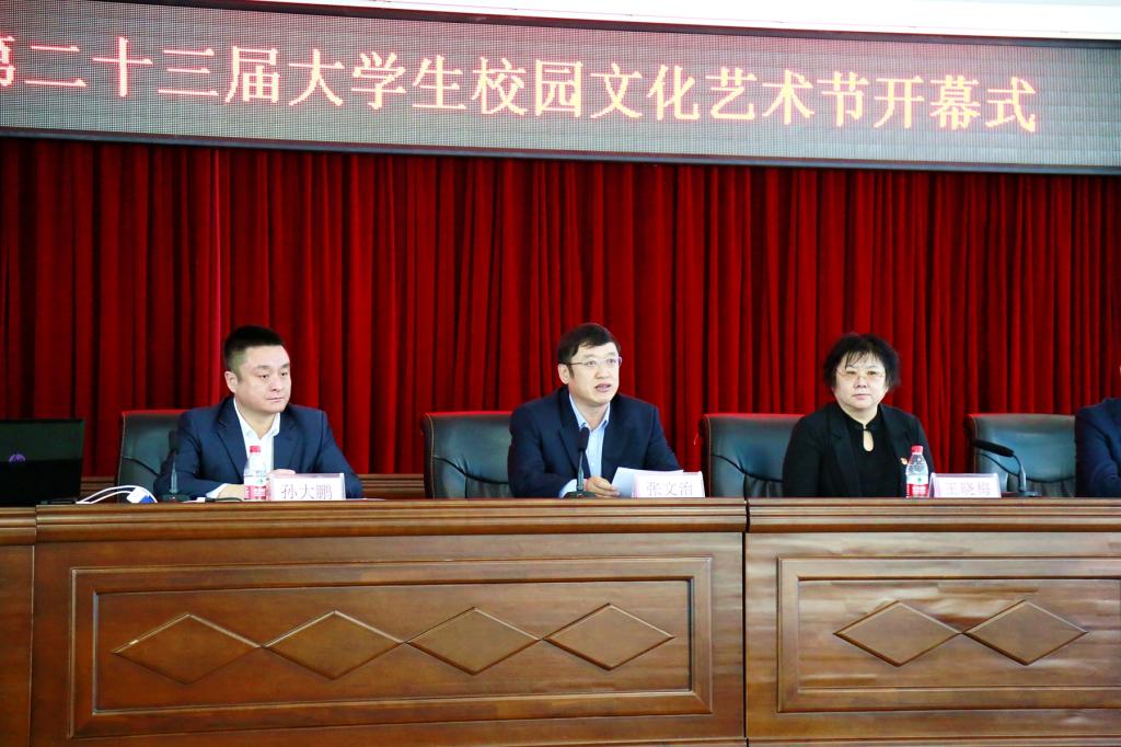 学校党委副书记、本届艺术节组委会主任张文治致开幕词。他代表学校对本届艺术节隆重开幕表示热烈祝贺,并向精心组织和积极参与的老师和同学们表示衷心感谢。他说,校园文化是全校师生的价值取向、文化认同、传统积淀等意识形态的总和,是学校发展的灵魂和大学精神的凝练,是提高学校文明程度、凝聚干事创业力量、展示学校形象的重要载体,对广大青年学生的人生观、价值观产生潜移默化的深远影响。校园文化艺术节是校园文化的浓缩,是学校办学特色的呈现,是全校青年学生魅力展现的舞台。