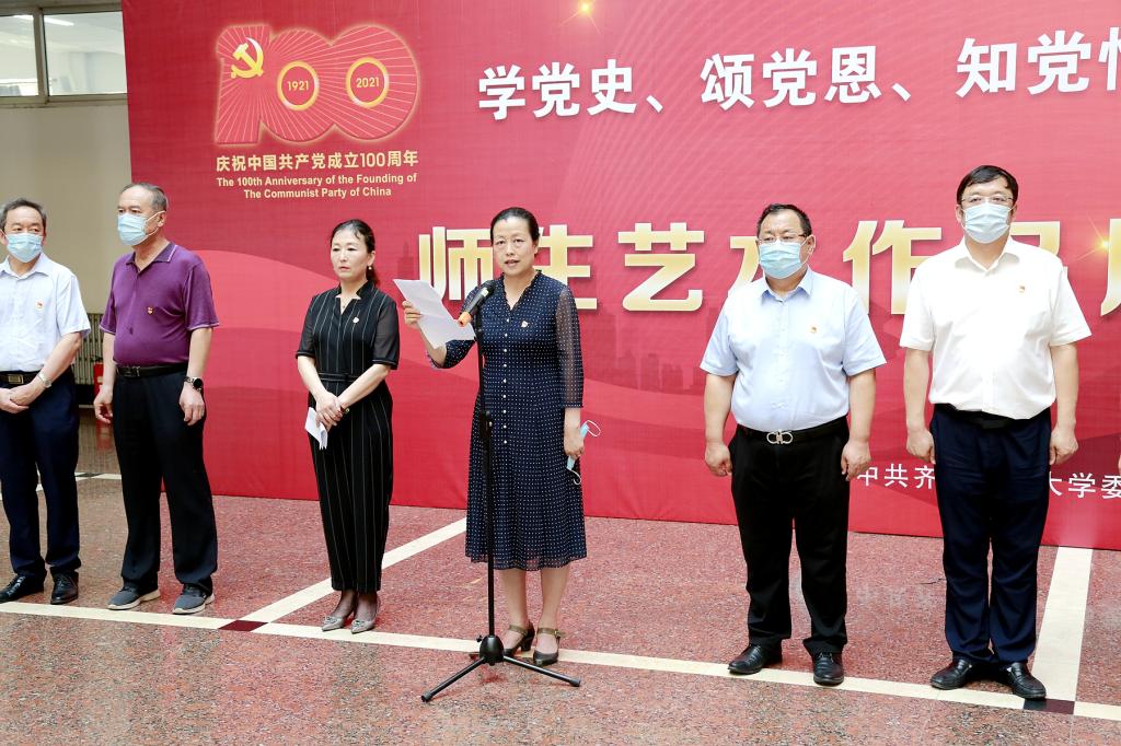 校党委书记陈桂芝在开幕式上致辞,她代表学校党委、代表学校党史学习教育领导小组对展览开幕表示热烈地祝贺!向辛勤筹备展览、精心创作的师生表示诚挚地慰问!