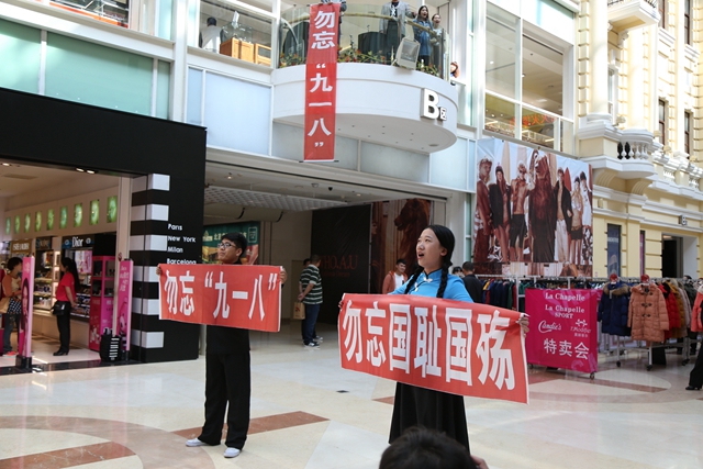1931年9月18日夜,盘踞在中国东北的日本关东军精心策划、制造了震惊中外的“九一八事变”。中国人民由此揭开十四年抗战的伟大爱国行动。今年是纪念“九一八事变”83周年。为了警示人们勿忘国耻、振兴中华,大力弘扬社会主义核心价值观,tyc1286太阳集团快闪团从2014年9月18日9时18分开始,分别在哈尔滨、齐齐哈尔两地开展了一次以“勿忘九一八,勿忘国耻国殇,践行社会主义核心价值观”为主题的“快闪”活动。