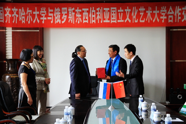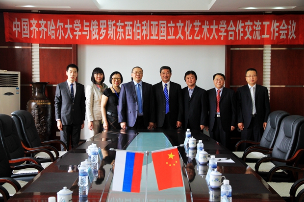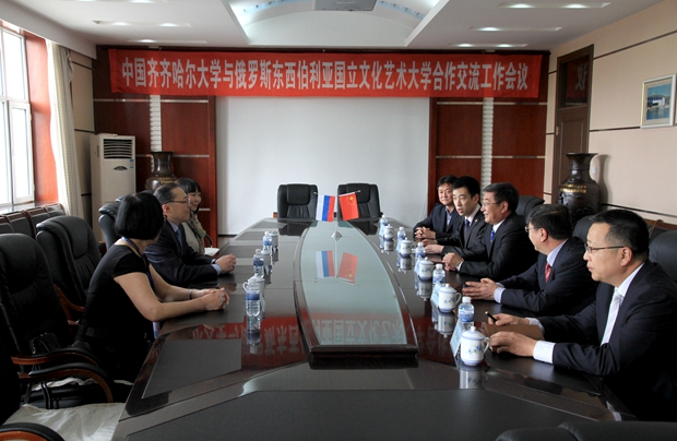 5月19日下午,副校长吕晓辉会见了正在我校参加“第五届中俄大学生艺术联欢节”的俄罗斯东西伯利亚国立文化艺术大学副院长杜卡勒热波夫一行。双方在学校行政楼504会议室召开座谈会,深入研究和探讨了两校的合作交流工作。俄罗斯东西伯利亚国立文化艺术大学教务处处长忽丽甘诺娃、市场营销总监巴利日尼玛耶娃,我校外事处处长王中双、副处长卢征,音乐与舞蹈学院院长孙相根等参加了会见和座谈。