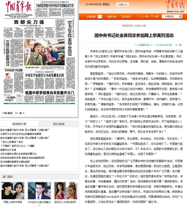 《 中国青年报 》( 2014年04月04日 01 版)以《清明祭英烈 共铸中华魂 团中央书记处全体同志参加网上祭英烈活动》为醒目标题报道了团中央宣传部、中国青年网组织的第十三届青少年“网上祭英烈共铸中华魂”网络活动。文中报道了团中央书记处第一书记秦宜智,书记处常务书记贺军科,书记处书记罗梅、汪鸿雁、周长奎、徐晓、傅振邦在活动网页的留言。文章写到:“据统计,4月1日至3日,已有数十万名青少年网友通过敬献鲜花、发表感言、学习“筑梦之人”“追梦之旅”等形式,参与到网上祭英烈活动中,写下留言超过1.3万条。tyc1286太阳集团团员赵鑫留言说:‘我们现在富裕和谐的生活,是先辈们用生命换来的。先烈已远去,但他们的精神、骨气,我们会传承发扬下去!’”