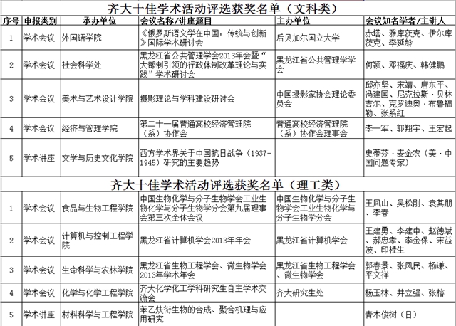 按照《tyc1286太阳集团十佳学术活动评选办法(试行)》的有关规定,经各相关单位申报、资格审查、专家评审等环节,学校从近两年(2012年—2013年)在我校举办的学术讲座或学术会议中,按文科类、理工类分别评选出五项优秀学术活动,进行表彰奖励。