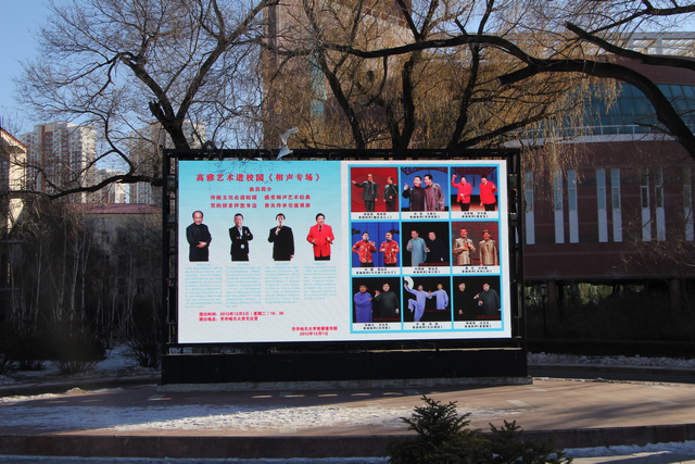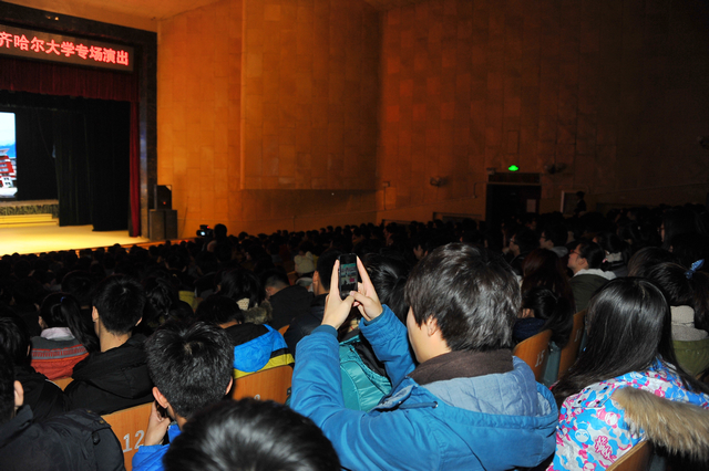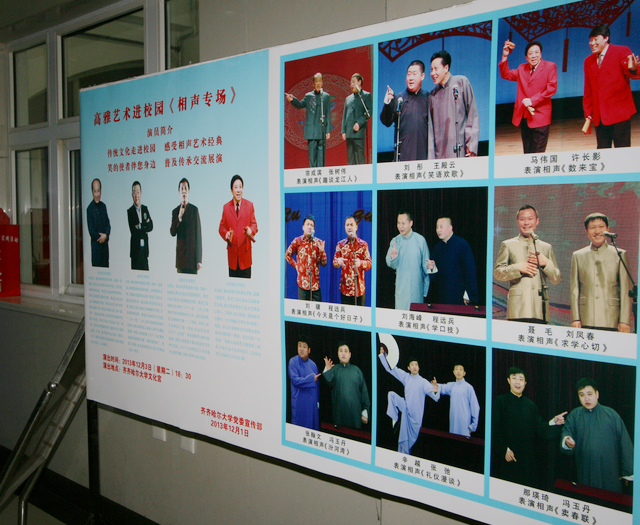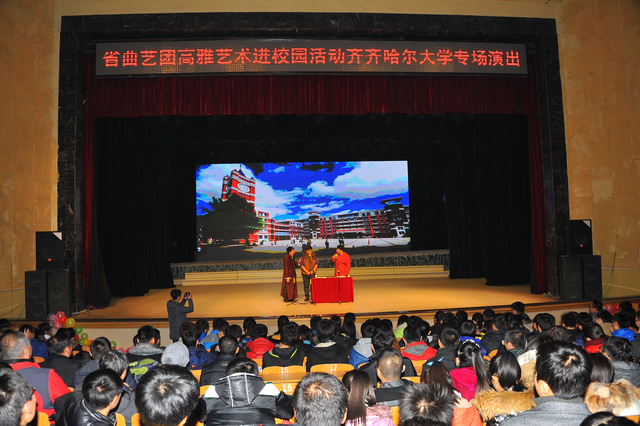 12月3日晚,作为黑龙江省“高雅艺术进校园”系列活动之一,黑龙江省曲艺团的17名专业演员前来我校,在中区文化宫为我校师生奉献了一场幽默风趣、富有教育意义的相声专场表演,让同学们从中受到一次传统艺术的熏陶。
