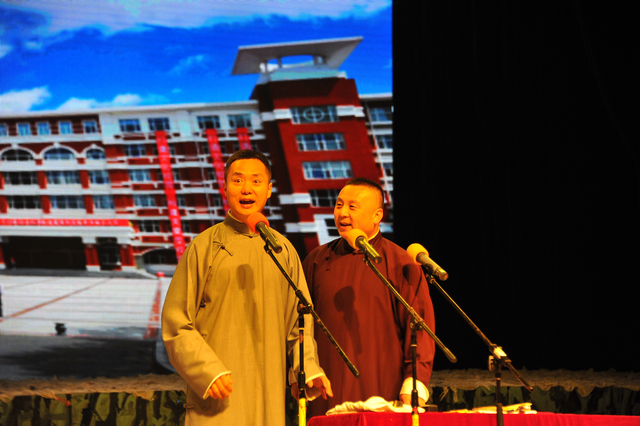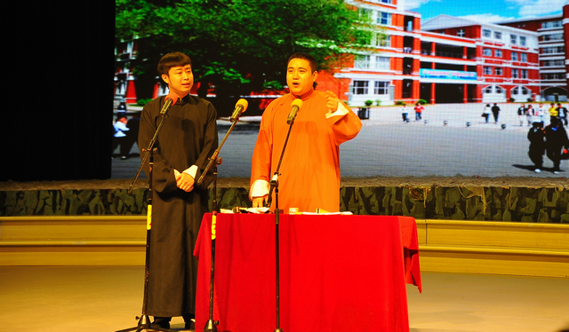 著名笑星、国家一级演员刘彤、王殿云表演的相声《语言漫谈》作为压轴曲目,热爆全场,在观众热情的“再来一个”呐喊声中,刘彤、王殿云等返场再次为现场师生表演了相声段子。