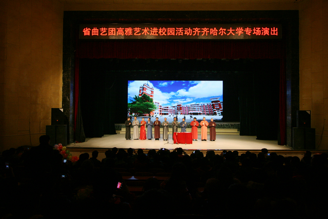 曲艺是中华民族各种说唱艺术的统称,是最具民族特点的表演艺术形式,被誉为文艺界与时俱进的“轻骑兵”。黑龙江省曲艺团组织的曲艺艺术进校园活动,以曲艺艺术讲座与基本功展示、曲艺表演相结合的方式进行,积极与现场学生互动交流,努力提升“90后”大学生对传统曲艺艺术的赏析能力,是黑龙江曲艺团老、中、青三代艺术家联手奉献的一台曲艺精品演出。
