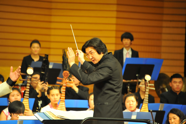 音乐会由青年指挥才俊陈曦泽执棒。在开场曲民乐合奏《龙腾虎跃》中启幕。这是一首中国民族打击乐中颇为著名的乐曲。乐曲由浙江东部地区的锣鼓《龙头龙尾》变化、发展而成。乐曲中的鼓乐在民族乐器的烘托下,显的特别气势磅礴,欢快热烈,洋溢着浓烈的节日气氛和浓郁的民族风格。