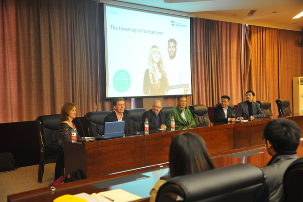 10月18日下午,英国北安普顿大学艺术学院院长Paul Middleton(保罗•弥尔顿)、北安普顿大学艺术学院副院长史蒂夫•泰勒、北安普顿大学服装设计教授凯瑟琳•威廉姆斯,国家新媒体基地高级顾问、中国传媒大学电视与新闻学院兼职教授、现代传媒创新与发展研究中心执行主任严军琦博士与中央电视台体育频道著名主持人袁文栋一行来校访问。