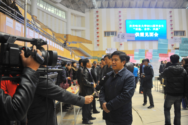 齐齐哈尔电视台、《齐齐哈尔日报》、齐齐哈尔新闻网等新闻媒体对本届“双选”会进行了现场采访、直播连线和热忱报道。常务副校长郑喜群接受了齐齐哈尔电视台《直播鹤城》记者的现场连线以及齐齐哈尔电视台《齐齐哈尔新闻》、《齐齐哈尔日报》、齐齐哈尔新闻网等媒体记者的现场采访,阐述了此次供需见面会的主要特点和就业形势以及我校促进学生就业的理念、举措和成效,产生了积极而广泛的社会影响。