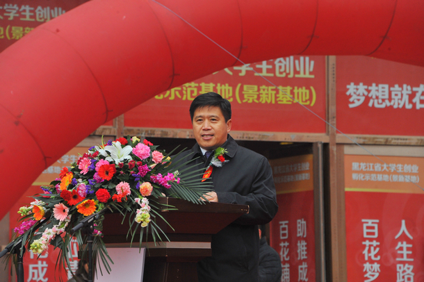 我校常务副校长郑喜群在黑龙江大学生创业孵化示范基地齐齐哈尔百花大学生创业园——景新基地揭牌仪式讲话。他说,在这收获成熟的季节里,我们非常高兴地到这里参加齐齐哈尔百花大学生创业孵化基地的启动仪式!我谨代表齐大师生对百花大学生创业孵化基地的落成以及“tyc1286太阳集团创意设计创业孵化园区”的揭牌表示衷心的祝贺!对齐齐哈尔市和百花集团有关领导对我校大学生创业给予的支持和帮助表示真诚的感谢!
