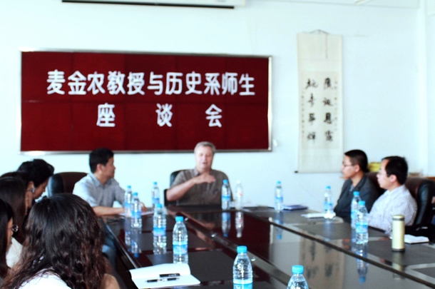9月8日上午,麦金农教授与历史系师生就史学理论、近代中日关系等问题在25教文史学院会议室举行了座谈。座谈会由历史系主任周彦教授主持,麦金农教授首先介绍了自己的研究经历,并总结概括了西方国家研究中国历史的现状,提出了全新的研究路径和视野。随后,麦金农教授细心回答了历史系师生提出的问题,并对历史系学生寄予厚望,鼓励学生努力学习,以谋求到理想的工作。这次座谈是历史系学生第一次与国际知名学者面对面交流,通过麦金农教授的讲解,不仅拓宽了学生的视野,更增加了学生对学术研究的兴趣。此次座谈会开辟了历史系学术交流的新渠道、新天地。