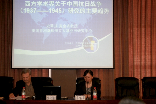下午,麦金农教授在德润大厦报告厅为全院师生作了题为《西方学术界关于中国抗日战争(1937—1945)研究的主要趋势》的学术报告,报告会由文学与历史文化学院副院长吴丽华教授主持,学校党委副书记盖元臣出席报告会。报告会上,麦金农教授详细地介绍了当前西方抗日战争学术研究现状及相关参考书目,并深入分析了战争环境、战争历史影响、人员成本、外交关系等问题,并为与会师生展示了很多由当年战地记者拍摄并保存下来的珍贵照片。报告内容丰富,展现了西方独特的研究视角,与会师生收获颇丰。报告结束后,麦金农教授回答了与会师生的问题,并为师生提供了研究网站,以帮助我们深入了解研究西方学术界关于抗日战争的研究现状。