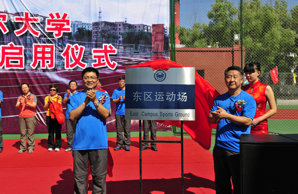 校党委书记李海红、校长马立群共同为东区运动场启用揭牌