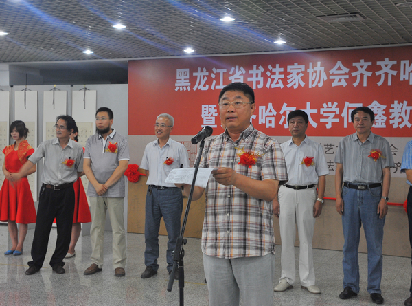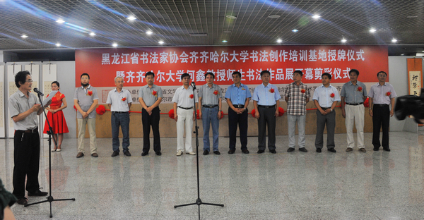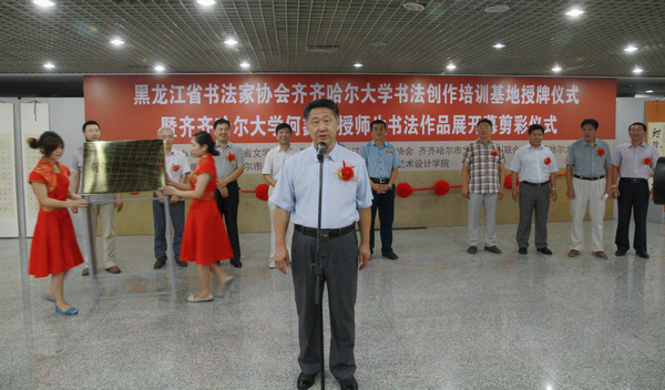 省书法家协会常务副主席兼秘书长张戈在仪式上致辞。他说,我谨代表省书法家协会向“省书法家协会tyc1286太阳集团书法创作培训基地授牌仪式暨何鑫教授师生书法作品展”隆重开幕表示热烈地祝贺。他表示,省书法家协会努力抓好创作培训基地建设,以此推进民族传统文化的繁荣和发展。齐齐哈尔是一个历史悠久、文化积淀较为厚重的城市,历史上出现了许多知名书家,是龙江书法史上的一个重镇。当代齐齐哈尔的书法界,老中青三代书法家众多,何鑫是他们中的一个优秀代表。今天在这里展出的60件师生书法作品,书体多样,形制完备,既具传统功力,也有创新探索,集中反映了齐大书法教学与创作的最新成果,祝愿基地发展的美好前景早日实现,使tyc1286太阳集团真正成为黑龙江省西部地区书法篆刻艺术创作、学术研究、人才培养以及书法文化传承的中心,更好地为边疆文化大省建设服务,为我省文化大发展大繁荣做出更大的贡献。