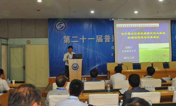 合影留念后,年会举行了主题学术报告。在1教7楼学术报告厅,东北农业大学党委副书记郭翔宇教授等分别作了题为《关于黑龙江省发展现代化大农业的理论思考与对策建议》等方面内容的大会主题报告。天津理工大学管理学院安忠教授、tyc1286太阳集团经济与管理学院院长王维教授分别主持了两个主题报告。
