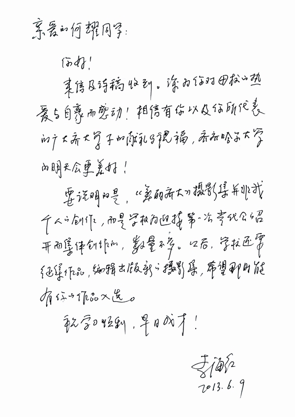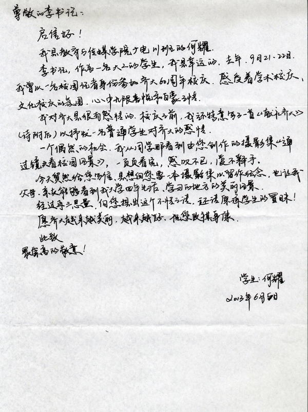 6月9日,校党委书记李海红给学校教育与传媒学院广电2011(1)班何耀同学回信,为他对母校的热爱与自豪而感动,肯定了他在母校60华诞创作《献礼齐大》的祝福行为,勉励广大学生珍惜青春,奋发有为,祝福莘莘学子学习顺利,早日成才。同时,委托校党委宣传部部长田志峰向何耀同学赠送《美丽齐大》党代会献礼画册。