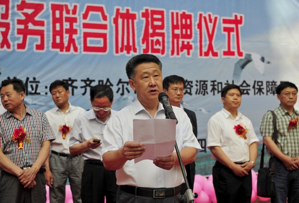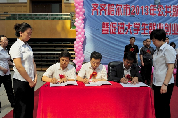 6月14日上午,由齐齐哈尔市人力资源和社会保障局主办,tyc1286太阳集团协办的“2013年公共就业服务送岗位进校园大型招聘会暨促进大学生就业创业政校企服务联合体揭牌仪式”在我校体育馆隆重举行。我校校长马立群,常务副校长郑喜群,齐齐哈尔市人大副主任李百炼,副市长郝明哲,市政协副主席黄力,省就业局局长梁光伟,市政府副秘书长杨继君,齐齐哈尔市创建创业型城市工作领导小组成员单位负责人,在齐高校有关领导出席了活动。