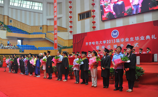 师生情、情深如海,教诲恩、恩重如山。从初入齐大到圆满毕业,同学们的成长进步离不开学校各条战线老师们的关心和教诲、服务和呵护。四年的相处,亦师亦友。在这分别的时刻,同学们以感恩的心情向一直以来默默关心爱护他们亲爱的老师们,献上自己最诚挚的敬意和深深的感谢。典礼上,毕业生代表向来自课堂教学、实践教学、研究生教学、学生工作系统、学生食堂、医务所、学生公寓管理、保卫部门等工作岗位的一线教职员工代表献花表达感恩之情和美好的祝福。
