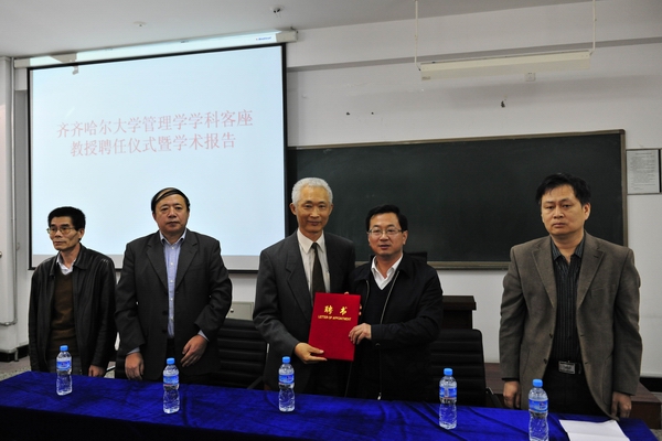 5月2日,美国波特兰州立大学都市研究哲学博士、美籍华人黄铁屿教授来我校为经济与管理学院师生作专题讲座和学术交流,并受聘为我校客座教授。在经管学院405多媒体教室举行了客座教授聘任仪式,党委副书记盖元臣出席聘任仪式并讲话。