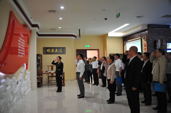 在省廉政教育基地实践考察活动结束时,我校深入贯彻党的十八大、校第一次党代会精神学习实践考察团一行面对鲜红党旗重温了入党誓词。