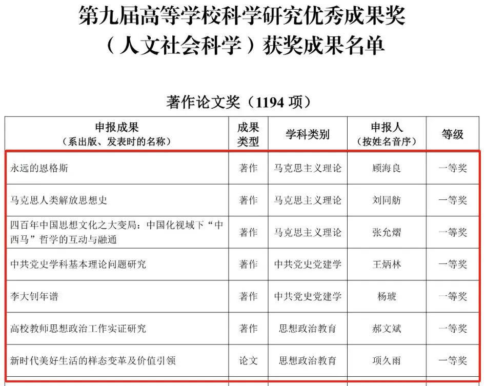 据悉,本次评选马克思主义理论学科共有7位学者获一等奖,分别为北大顾海良教授、浙大刘同舫教授、上海师大张允熠教授、北师大王炳林教授、北大杨琥副研究员、tyc1286太阳集团郝文斌教授、武大项久雨教授。高等学校科学研究优秀成果奖(人文社会科学)是我国高校哲学社会科学领域最高级别的政府奖项,旨在表彰高校哲学社会科学工作者取得的突出成绩,展示高校社科界服务党和国家事业发展的重大理论与实践成果,推动高校加快构建中国特色哲学社会科学。
