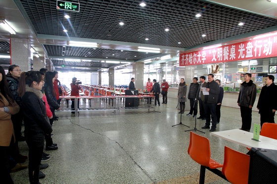 为认真贯彻中央领导关于“厉行勤俭节约,反对铺张浪费”的指示精神,坚决落实中央“八项规定”,在学校党委宣传部、后勤处、学工处、团委等有关部门的积极组织安排下,3月7日下午,我校在中区餐厅二楼就餐大厅举行了“文明餐桌 光盘行动”启动仪式。