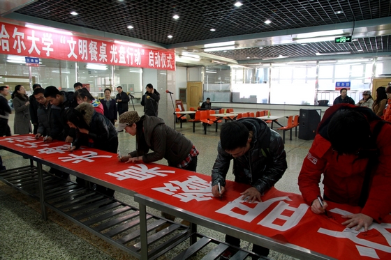 启动仪式后,与会领导与现场师生们一起在“文明餐桌 光盘行动”红色条幅上签名。