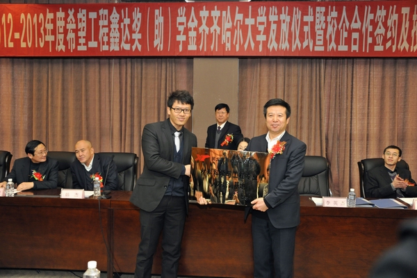 高分子材料与工程专业学生陈国庆代表全体受助学生向韩杰董事长以及黑龙江省青少年发展基金会表达了感激之情,并表示一定常怀感恩之心,努力学习,回报社会,让今天的爱心之火永远传递下去。我校2002届毕业生现任黑龙江鑫达企业集团生产技术部经理的魏显明校友在致辞中也表达了自己对母校的感情以及汇报了自己在企业的发展情况。