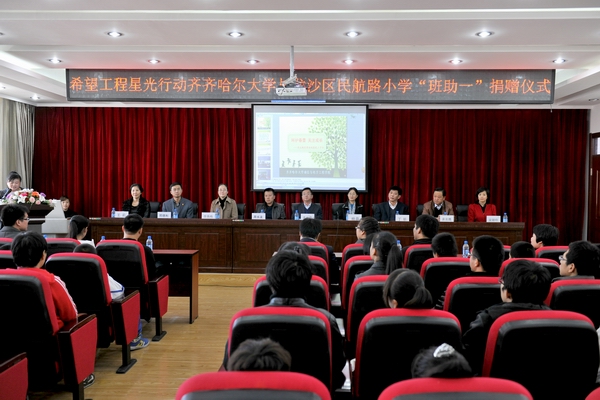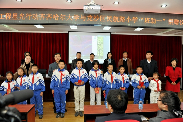 通信与电子工程学院党委书记丁昕、校团委书记李秀梅、团市委副书记郑德利、通信与电子工程学院党委副书记、副院长吴银玲为龙沙区民航路小学学生发放了资助款6000元;团市委书记周长友、区委副书记袁克鹰为受资助学生颁发结对卡;省青基会秘书长杨晶为献爱心的10个班级颁发了捐赠证书;龙沙区民航路小学校长王莉为通信与电子工程学院团委书记、希望工程星光行动项目负责人迟生茂颁发了锦旗;受资助学生于卓的母亲做了发言;希望工程星光行动“呵护春蕾、关注成长”志愿者服务队负责人宣读了“班助一”的具体内容,即每班每年为每名受资助的农民工子女捐赠600元学习生活补助费用;定期进行一对一家教免费辅导;定期开展心理教育辅导与安全教育讲座;以半月为周期,不定期开展一次科普、环保讲座、联欢、参观校园等大型集体活动。