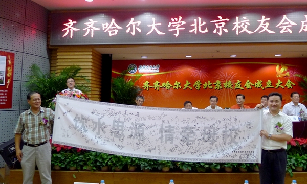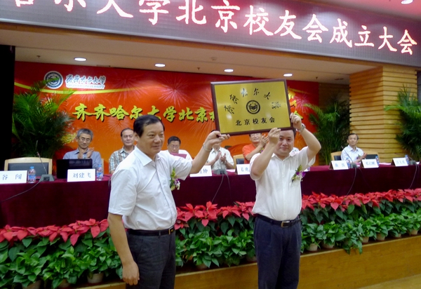 副校长邓启刚在大会上发表了热情洋溢的讲话并为北京校友会授牌。他还诚挚地邀请校友们回校参加9月22日母校60周年华诞庆典!