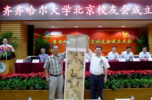 副校长王刚向北京校友会赠送了母校的礼物,同时接受了北京校友会成立大会与会校友亲笔签名祝福母校60周年华诞的贺礼。