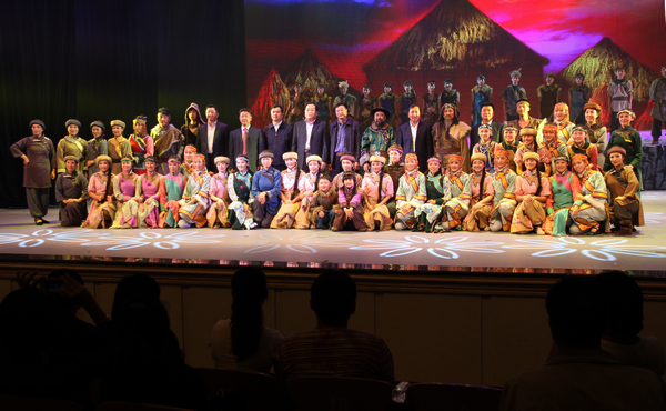 大型风情音画《达斡尔人》演出结束时,省直部门领导沃岭生、张翔、庞光明、李豪岩等和校领导李海红、马立群走上舞台,与演职人员亲切握手致贺并合影留念。
