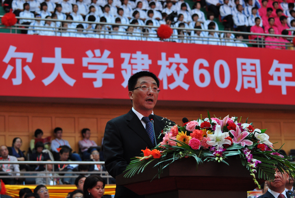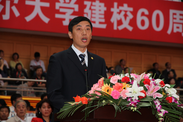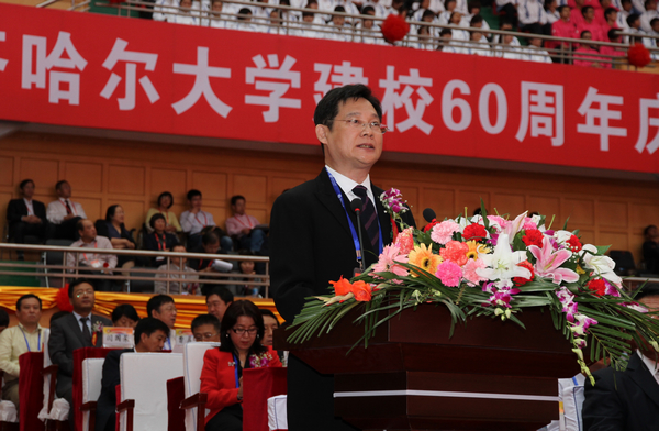 副省长程幼东在建校60周年庆祝大会上讲话。他谨代表黑龙江省人民政府向tyc1286太阳集团60华诞表示热烈的祝贺!向全校师生员工和广大校友致以崇高的敬意!向为学校发展建设付出辛勤汗水的教育工作者表示衷心的感谢!