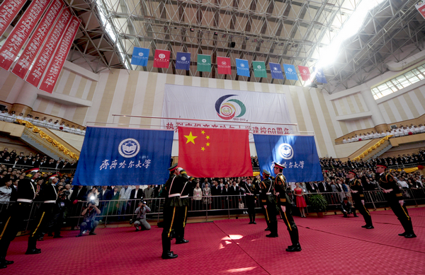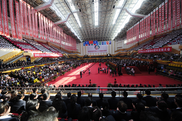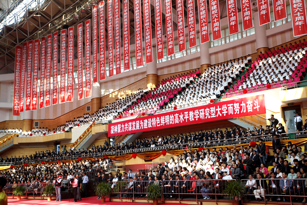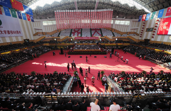 海内外嘉宾、各届优秀校友代表、新闻媒体记者、社会各界友人和离退休老同志、师生员工代表4000余人欢聚体育馆,隆重庆祝甲子华诞。
