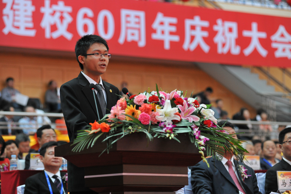 母校对对于在这里学习、工作和生活的师生而言,是一方家园、土壤和摇篮。“龙江学者”特聘教授、化学与化学工程学院院长郭祥峰教授在代表教师发言时深情地说,我在tyc1286太阳集团学习、工作二十多年,聆听和目睹了学校六十年的风雨历程、六十载的沧桑巨变,真切地感受到了老一辈齐大人对教育事业的忠诚,他们的谆谆教诲至今回响在耳边。在今天这激动人心的庆典时刻,心中充满了对老一辈齐大人的感激!没有他们坚实的臂膀,就没有我们今天的辉煌。我为tyc1286太阳集团骄傲,为tyc1286太阳集团自豪。展望未来,我们满怀信心。我们用智慧和汗水共同开创tyc1286太阳集团更加灿烂的明天!校学生会主席肖振天代表全体在校生郑重“向培养我们多年的母校道一声:‘生日快乐’!”他说,生活在这里的每一天,我们都倍感温馨、幸福,内心充满了对母校的敬意和感激。作为新一代齐大学子,我们将用自己的实际行动诠释‘齐大学子’这个光荣的称号。”