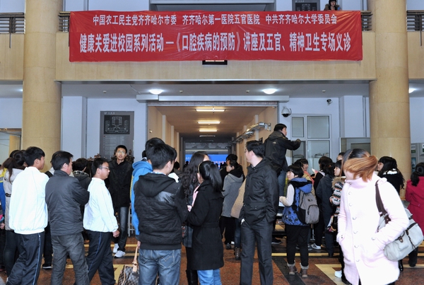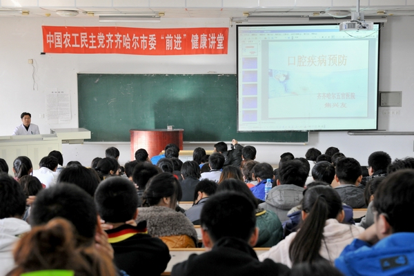 霜降后的十月已经让我们感受到冬天的寒意,但校园里涌动着一股暖流却温暖着师生的心田。10月17日下午,农工党市委、市第一院五官医院、校党委联合主办的“健康关爱进校园”系列活动‑‑‑‑‑‑‑‑《口腔疾病的预防》讲座及五官、精神卫生专场义诊活动在西区主楼举行。出席本次活动的有农工党市委副主委戴晓霞、郑永杰、李继伟,秘书长陈曦、市委统战部党派处副处长步建伟。我校校长、农工党市委主委马立群、校党委常务副书记王凤琴、党委副书记盖元臣、常务副校长郑喜群、校党委统战部部长田志峰及近1000名师生参加了活动。