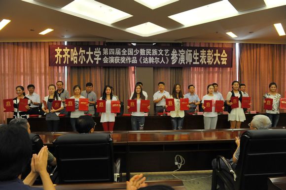 党委常务副书记王凤琴宣读了tyc1286太阳集团《关于表彰< 达斡尔人>参演师生的决定》。学校决定对我校音乐与舞蹈学院参加《达斡尔人》全体创作演出人员进行表彰和奖励。授予陈广等36名参演学生社会实践优秀奖,奖金每人500元;授予张晓红同志学生社会实践优秀指导教师奖,奖金1000元;授予音乐与舞蹈学院特殊贡献奖,奖金5000元。希望受到表彰的集体和个人戒骄戒躁,再接再厉,再上新台阶,再创新佳绩。希望全校师生要向获奖集体和个人学习,以高度的文化自觉与自信,进一步推进校地合作深入开展,促进校地文化发展繁荣,不断提高学校办学水平,共同谱写我校高水平大学建设美好新篇章!