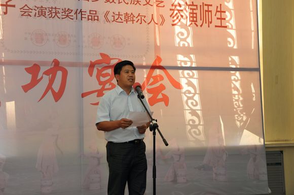 今天,我们在这里隆重召开大型风情音画《达斡尔人》参加第四届全国少数民族文艺会演总结表彰大会。《达斡尔人》整个创作、排练和获奖过程,始终得到社会各界和学校的高度重视,音乐与舞蹈学院师生和相关部门同志付出了辛勤的汗水。我代表学校向受表彰的音乐与舞蹈学院以及获奖师生表示热烈的祝贺!向全体参演人员致以亲切的问候!感谢你们为学校争得了荣誉!