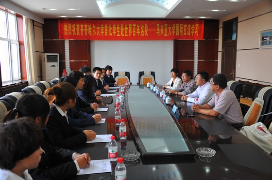 校长马立群亲切会见了马来亚大学驻中国办事处彭霞老师及我校9名即将赴马的学生。马立群校长对同学们通过层层遴选顺利成行表达了祝贺,他勉励大家珍惜这次难得的学习机会,努力学习,团结互助,开阔视野,增长见识,成为齐大形象的使者、中马文化交流的使者。