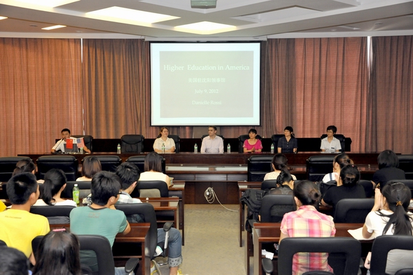 会谈结束后,美国驻沈阳总领事馆副文化领事吴剑向我校图书馆赠送了图书。美国驻沈阳总领事馆Danielle Rossi女士、信息中心助理肖白为我校学生做了美国高等教育情况专题讲座。