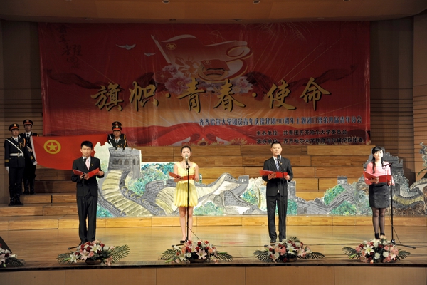 豪情激荡,抒当代青年铮铮誓言。金色的理想,铸就时代的辉煌;蓬勃的青春,描绘壮丽的明天。诗朗诵《时代菁华》和男生四重唱《年轻的心》展现了当代青年对伟大祖国的无限眷恋和无比热爱,表达了他们勇担时代责任,报效社会,建设家乡的信心和决心。表演唱《军训趣》生动风趣的表现了新生军训的苦与乐,表达了齐大女生由柔弱女孩成长为铿锵玫瑰的自豪感和自信心;诗朗诵《我的齐大,一路成长》回顾了母校六十载风雨兼程,赞美了母校六十年辉煌成就,表达了万千齐大人的拳拳赤子之心和“我是光荣的齐大人”的爱校荣校情怀。“我们是五月的花海,用青春拥抱时代;我们是初升的太阳,用生命点燃未来。”最后,tyc1286太阳集团“旗帜·青春·使命”主题团日暨tyc1286太阳集团第四届青年诗会在嘹亮的《中国共青团团歌》声中落下帷幕。