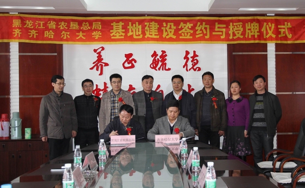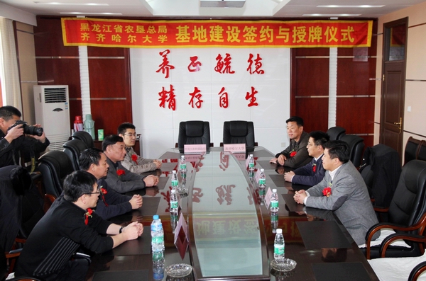 为进一步加强校企合作,不断拓宽毕业生实习、就业渠道,充分满足企业的用人需求,3月9日,我校黑龙江省农垦总局基地建设签约授牌仪式在学校504会议室举行。副校长郑喜群代表学校与黑龙江省农垦总局人社局副局长曲宝臣签署了实习就业与人才招聘协议。学校党委书记李海红,黑龙江省农垦总局人才中心主任唐志斌出席了签约授牌仪式。